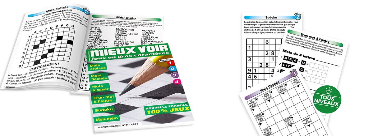 Amateurs de mots croisés, mots fléchés ou sudoku , retrouvez le plaisir de jouer avec les magazines de jeux en gros caractères Mieux Voir . Spécialement conçus pour les personnes malvoyantes et...